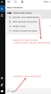 Para acceder ha estos comandos lo primero que tenemos que hacer es acceder a la consola desde el inicio y poner "cmd", una vez echo pulsamos botón derecho del ratón sobre el "símbolo del sistema" y seleccionamos "ejecutar como administrador".